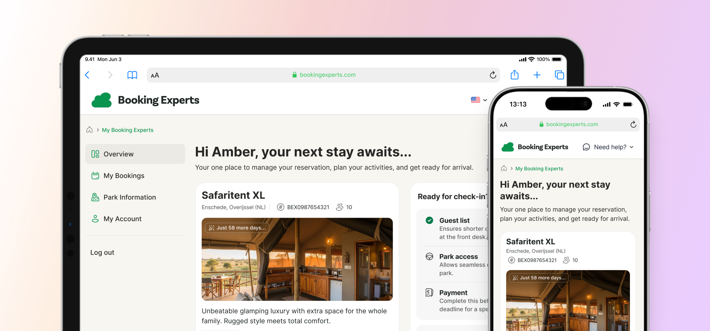 Das Gästeportal wurde einer umfassenden Überarbeitung unterzogen, mit einer aufgefrischten Benutzeroberfläche und einem mobilfreundlicheren Design, das das einzigartige Branding deiner Organisation einbezieht. Gäste profitieren nun von einer klareren Buchungsübersicht, einem speziellen Bereich für Zahlungsfristen und einer Checkliste für wichtige Check-in-Aufgaben, wie das Vervollständigen von Gästelisten und das Hinzufügen von Kennzeichen.